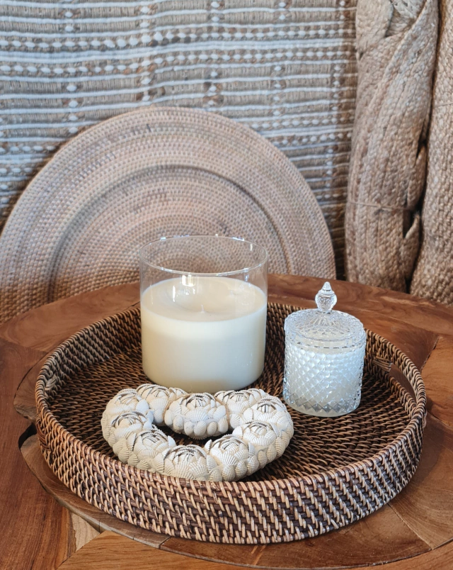 BANDEJA CONFECCIONADA EN RATAN NATURAL MODELO REDONDO CON MANIJAS INTERNAS.