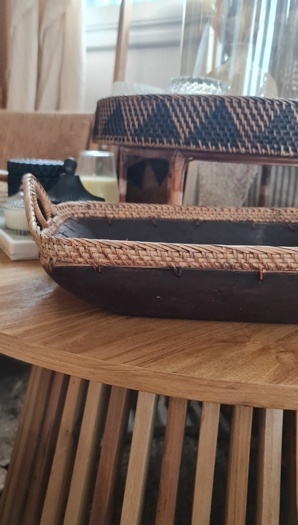 Bandeja rectangular de rattan y madera suar.