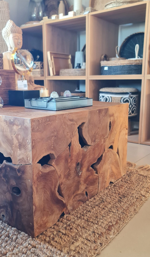MESA BAJA CONFECCIONADA EN LONJAS DE RAICES DE MADERA TECA, ESTRUCTURA DE MADERA.
