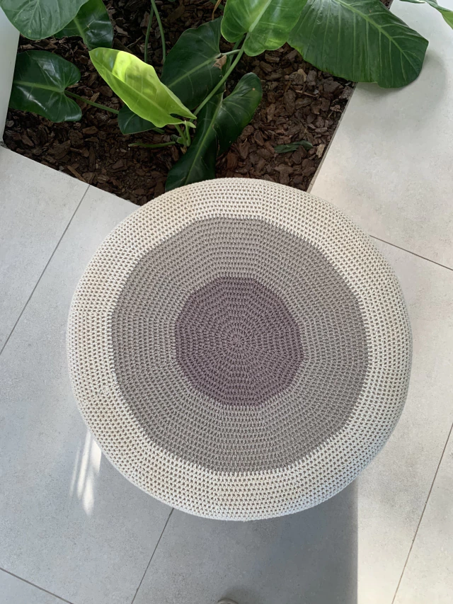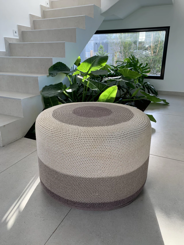 PUFF/ ASIENTO CONFECCIONADO EN ESPUMA DE 28KG, TAPIZADO EN EN BLANCO CON FUNDA TEJIDA AL CROCHET PUNTO Y PUNTO BARETA CON HILO MOHAIR.