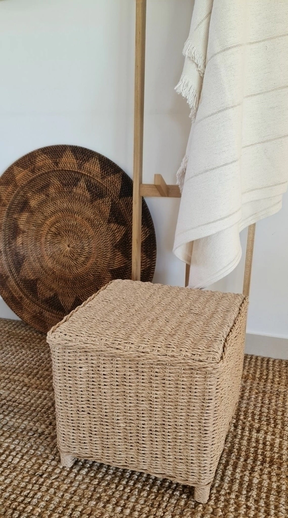 PUFF/BANCO TEJIDO CON FIBRA DE KRAFT, ESTRUCTURA DE FENOLICO Y MIMBRE.