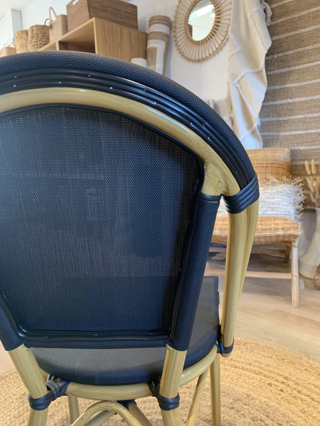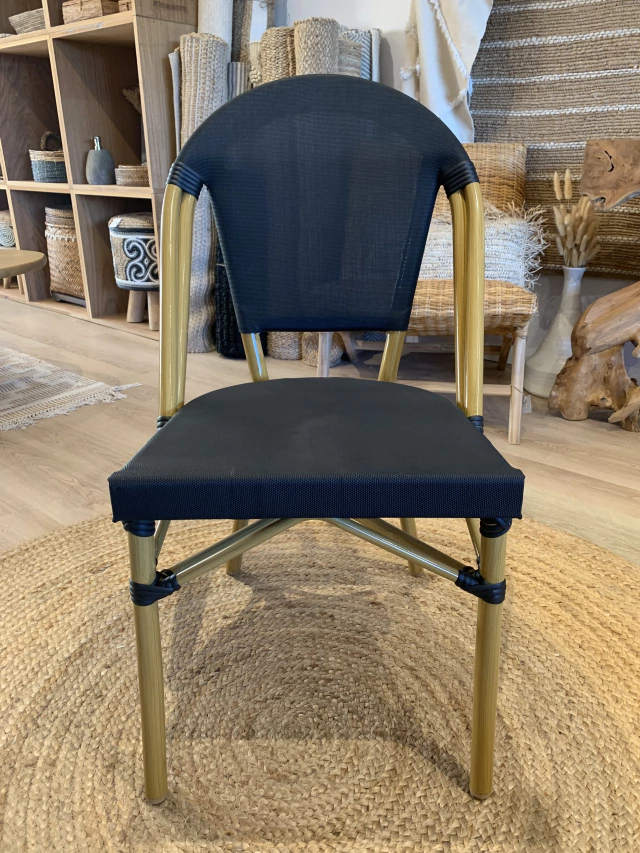 SILLA CONFECCIONADA EN TEJIDO TEXTILENO PLASTICO CON ESTRUCTURA DE ALUMINIO SIMIL MADERA. AMBOS MODELOS SON APILABLES.